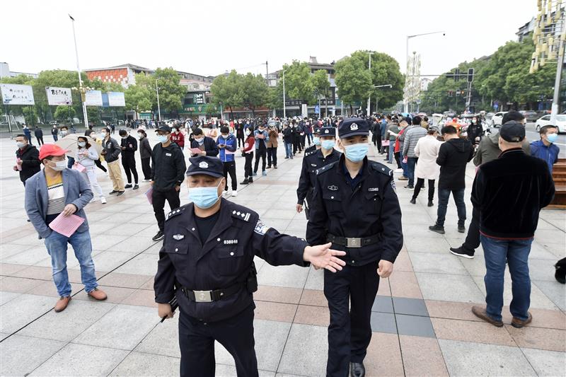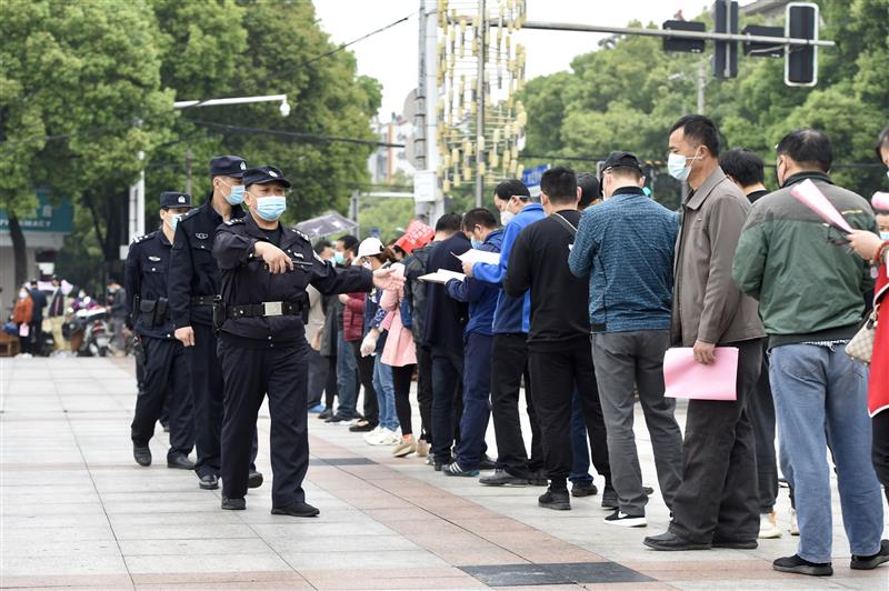 图为江夏公安分局民警现场维持秩序,提醒求职者保持距离。