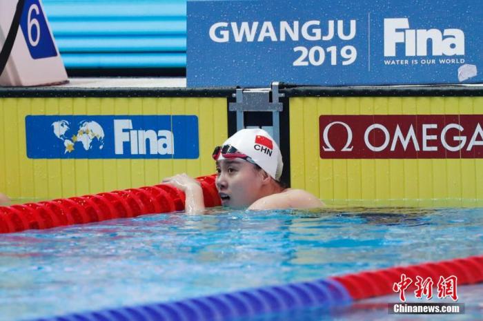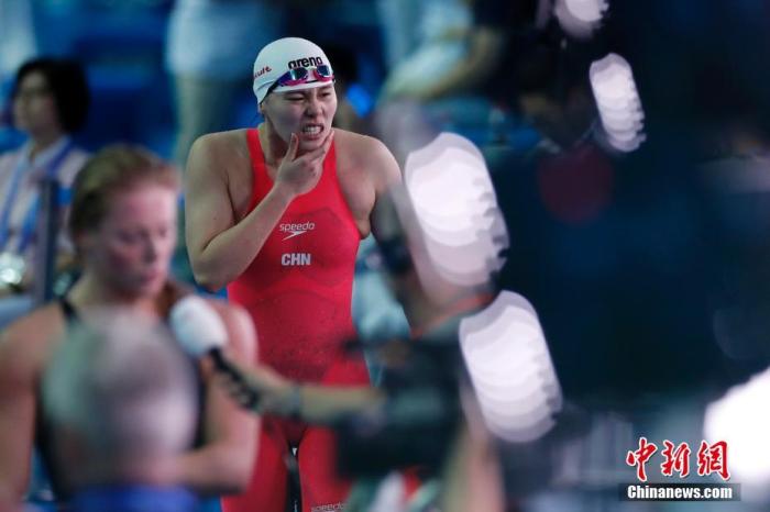 资料图:2019年7月24日,傅园慧比赛后接受采访。当日,在韩国光州举行的2019国际泳联世界游泳锦标赛女子50米仰泳半决赛中,中国选手傅园慧以27秒84获得小组第四,总排名第九,无缘决赛。中新社记者 韩海丹 摄