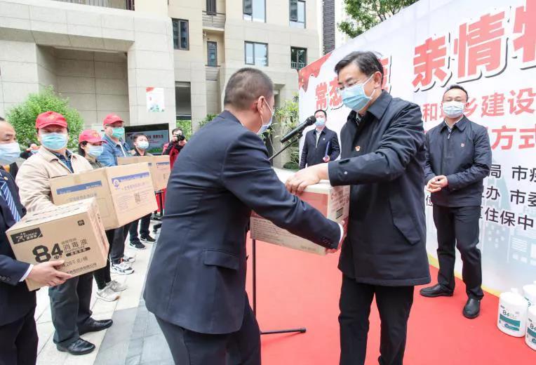 为物业人员赠送防疫物资。宜昌市住建局 供图