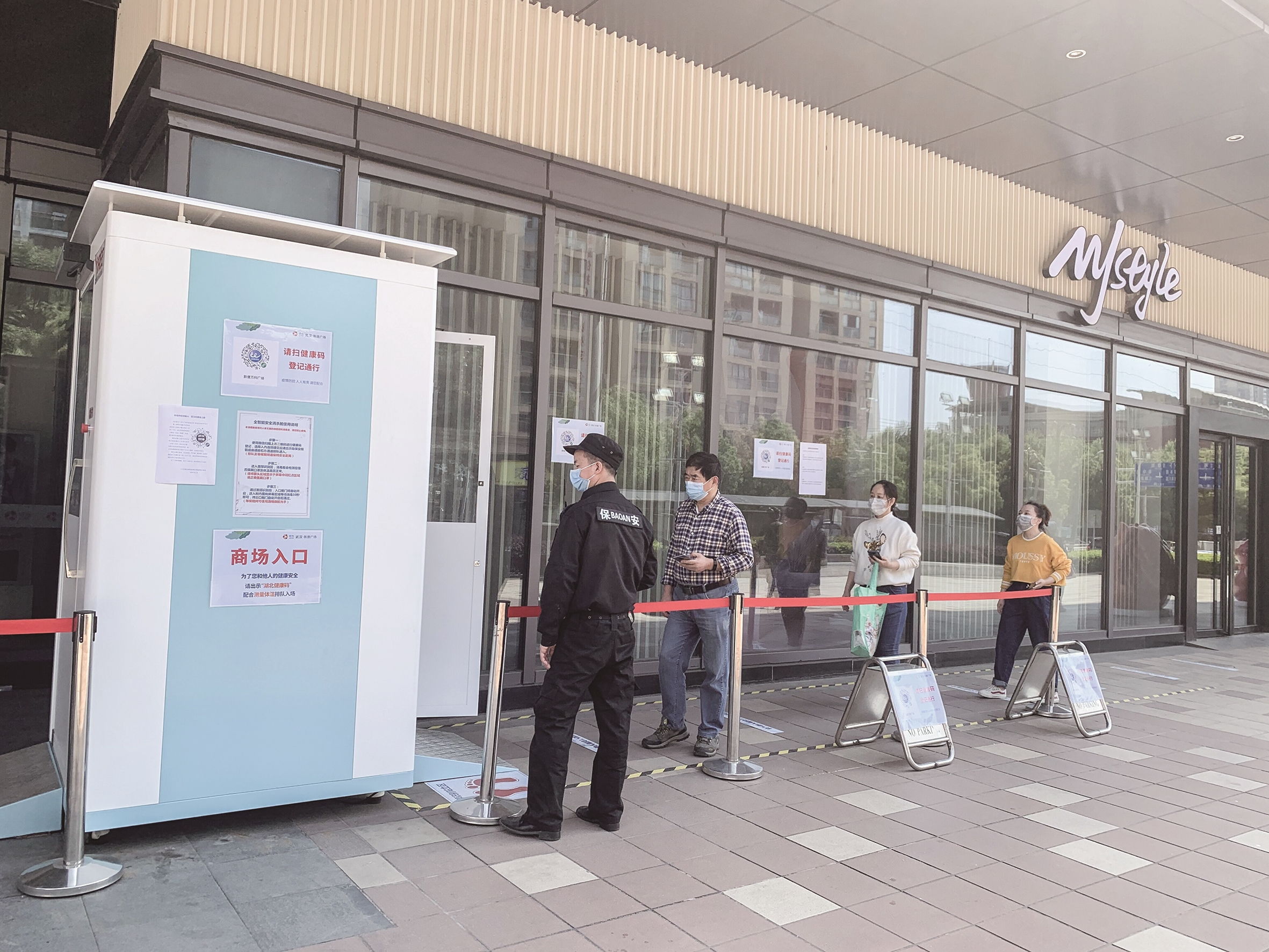 记者看到,该防疫舱外形像一个白色岗亭,摆在商场入口一侧。顾客扫码显示健康码呈绿色后,由保安指引到岗亭前排队,每人间隔1.5米。记者排队先在岗亭入口处的摄像头刷脸,摄像头检测确认记者佩戴口罩,检测体温合格后,舱门自动打开。入舱后,舱底和侧壁的设备喷出消毒喷雾,对记者全身消毒。约20秒后,另一侧舱门自动打开,记者从舱内走出,顺着通道进入商场,后面排队的顾客则接着进入舱内消毒。