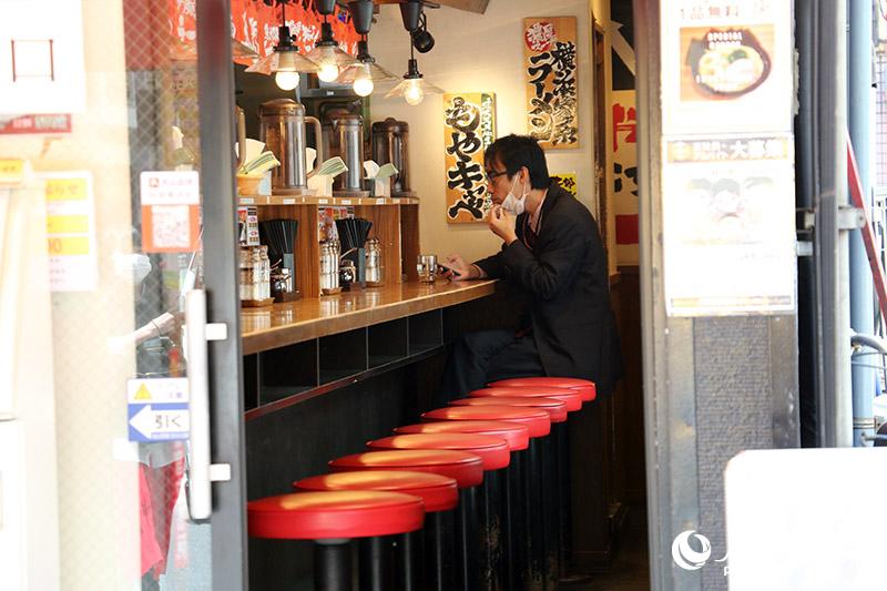 这是一家在东京较有名气的大型连锁拉面店,由于性价比高,味道好,在以往的午餐时间都会坐满客人。但是现在午餐时间,也只有一名客人入店消费。