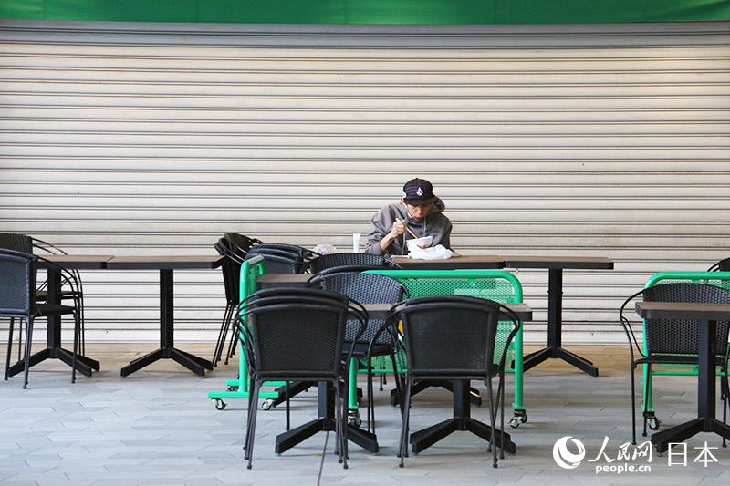 一名日本民众在停业的快餐店门口食用自己在别处购买的午餐。通常这里都会坐满小憩的民众,现在已将大部分桌椅收起,只保留了小部分座位为路上行人提供方便。