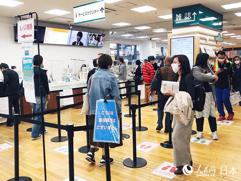 在池袋某大型书店内,却有不少日本民众前来购书。为了防止病毒传播,地面上标注了等待付款时,人与人的间隔距离。也正因此,等待付款的队列排了很长。为了避免传染风险,书店内也关闭了部分收银台,最大限度减少了工作人员数量。