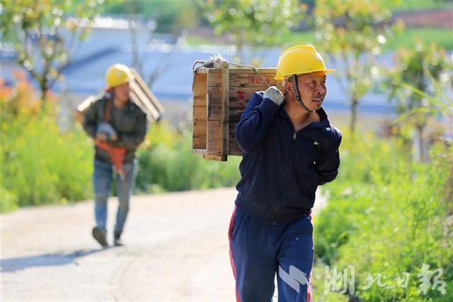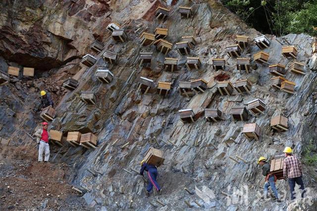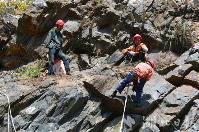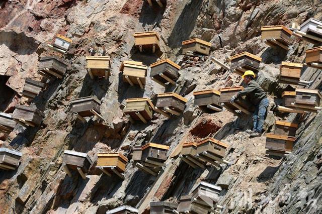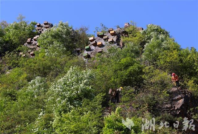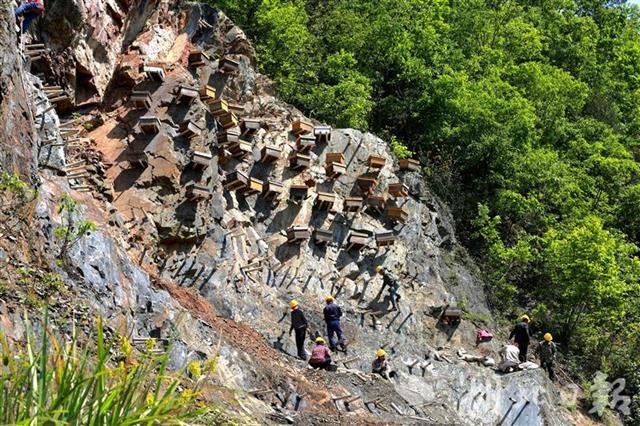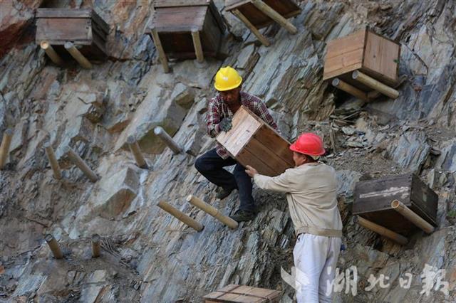 湖北日报讯(通讯员朱本双、陈美金)4月25日,在十堰市竹山县擂鼓镇广山村月亮湾的石壁上,专业的“蜘蛛人”在悬崖上施工,悬挂蜂箱。