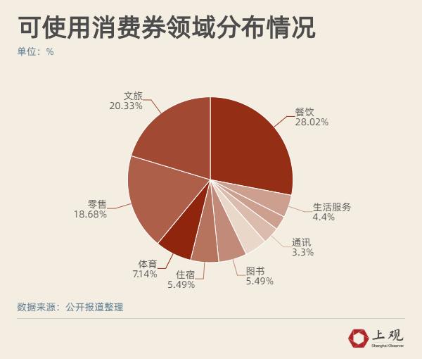 各地发放的消费券能用于哪些领域?从消费券的类别来看,28.02%涉及餐饮业,其次是文旅业,占比达20.33%。同时,零售、体育、住宿、图书、生活服务等也是此次消费券发放所涉及的行业。