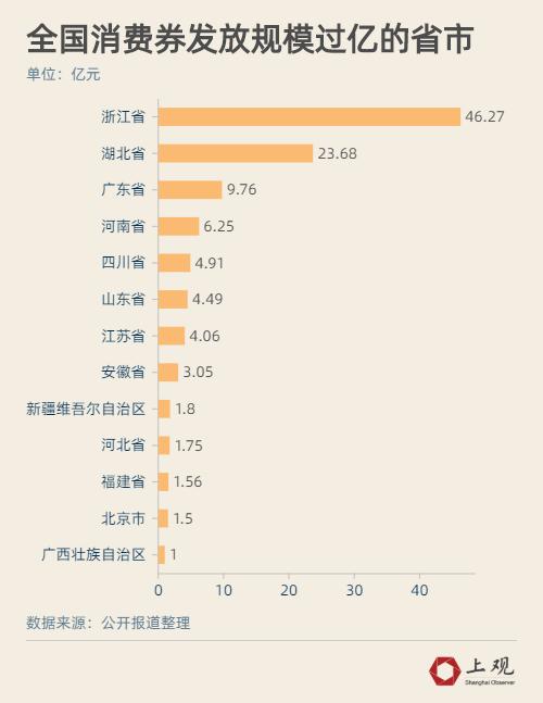 约有25个省(直辖市)发放了消费券。其中13个省市发放消费券总额过亿元。