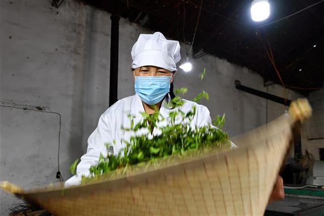 4月25日,在保康县歇马镇百峰村香炉山茶旅庄园,一名茶农在茶叶加工车间筛选茶叶。