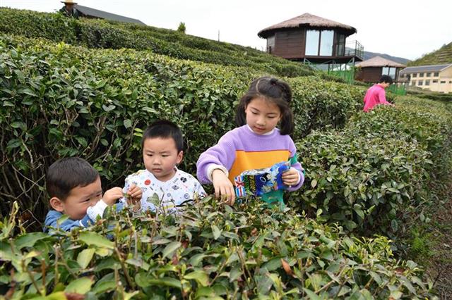 4月25日,几名小朋友在保康县歇马镇百峰村香炉山茶园体验采茶。
