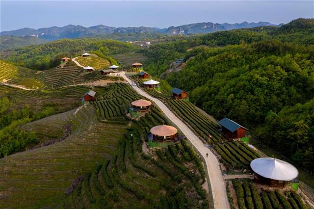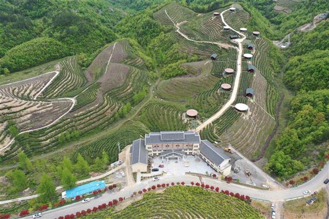 4月25日航拍的保康县歇马镇百峰村香炉山茶园。保康县歇马镇百峰村香炉山茶园面积400亩,紧临九路寨4A景区,是通往九路寨景区的必经之地。2019年以来,歇马镇结合现有茶园布局打造香炉山茶旅融合项目,围绕茶产业、茶文化、茶旅游的思路,打造集茶园、旅游、民宿等功能为一体的旅游融合示范区,带动当地贫困群众增收致富。近年来,保康县坚持茶园就是景观的理念,把乡村旅游与发展茶叶产业相结合,打造百峰香炉山茶旅融合项目等一批乡村旅游景点,助力乡村振兴,走出一条茶旅融合发展之路。(视界网杨韬摄)
