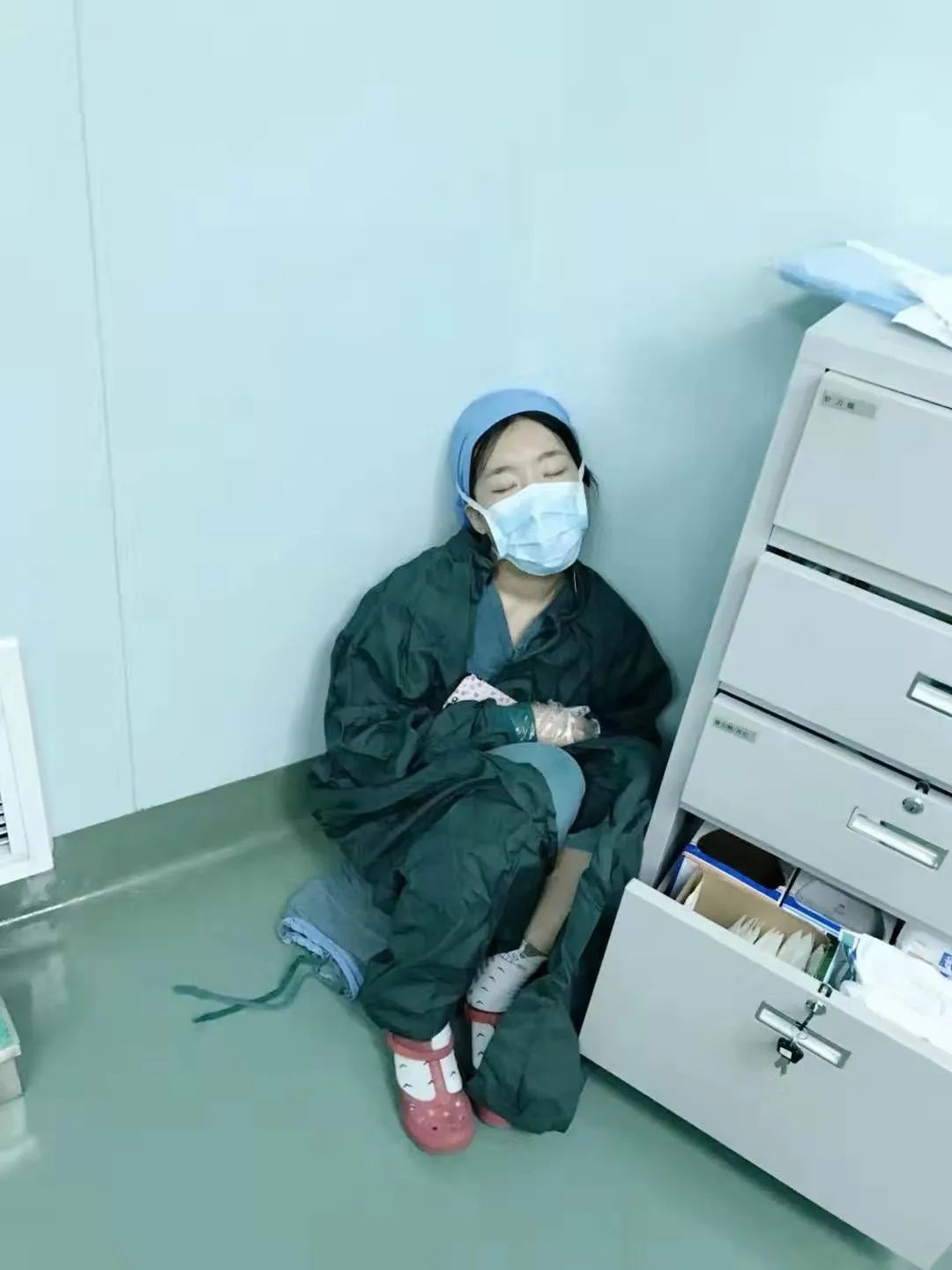 在这张照片里,因为日夜连轴转,她蜷在角落里想坐着休息会儿,没想到竟然睡着了。一位患者看到这一幕,立刻拿起手机留下了这一瞬间。
