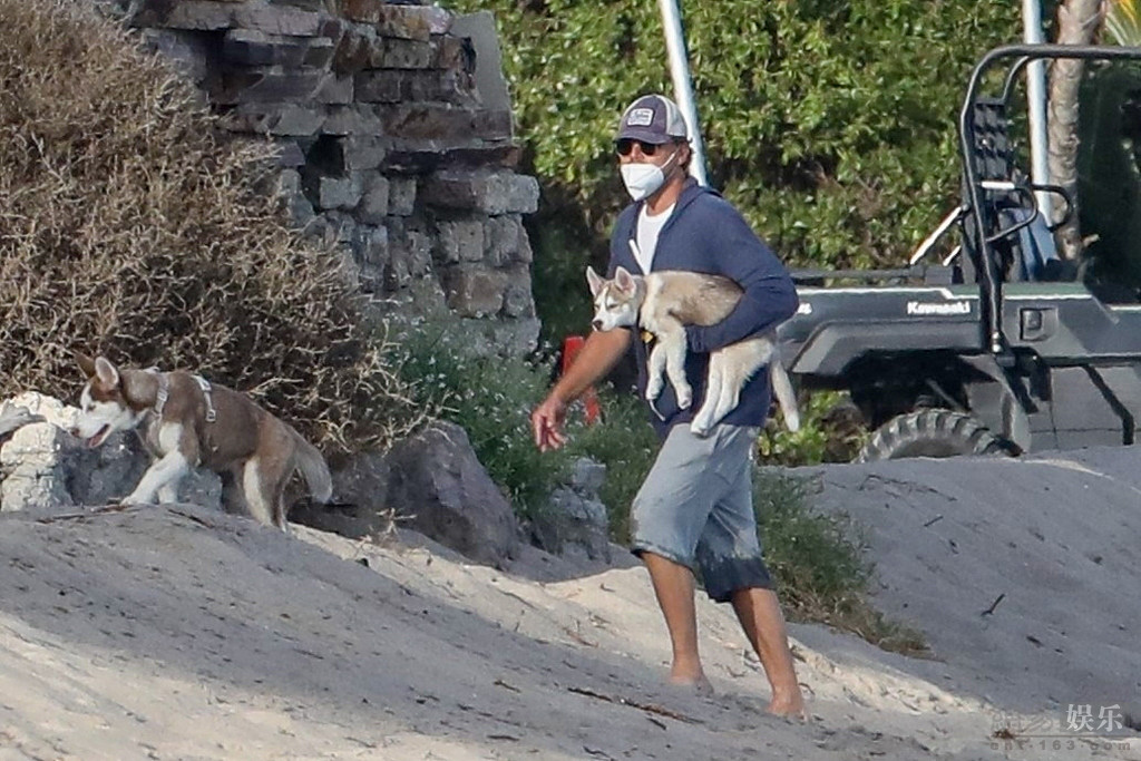 “小李”莱昂纳多光脚现身海滩遛哈士奇