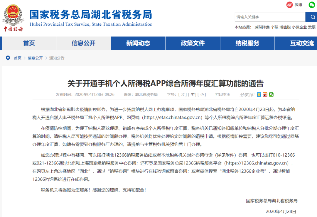 自2020年4月28日起,为湖北省纳税人开通自然人电子税务局手机个人所得税APP、网页端等个人所得税综合所得年度汇算远程办税渠道。