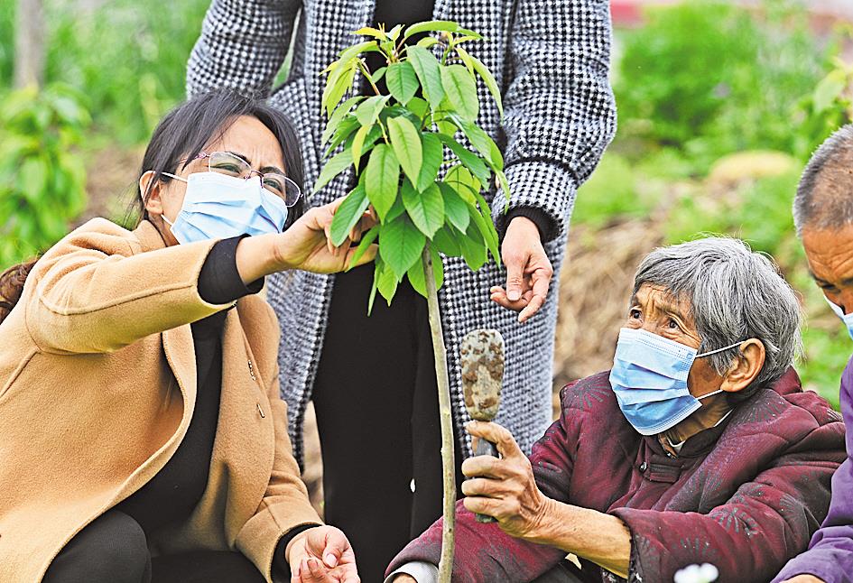 4月23日,宋祖贵给新种下的大樱桃树苗修枝。