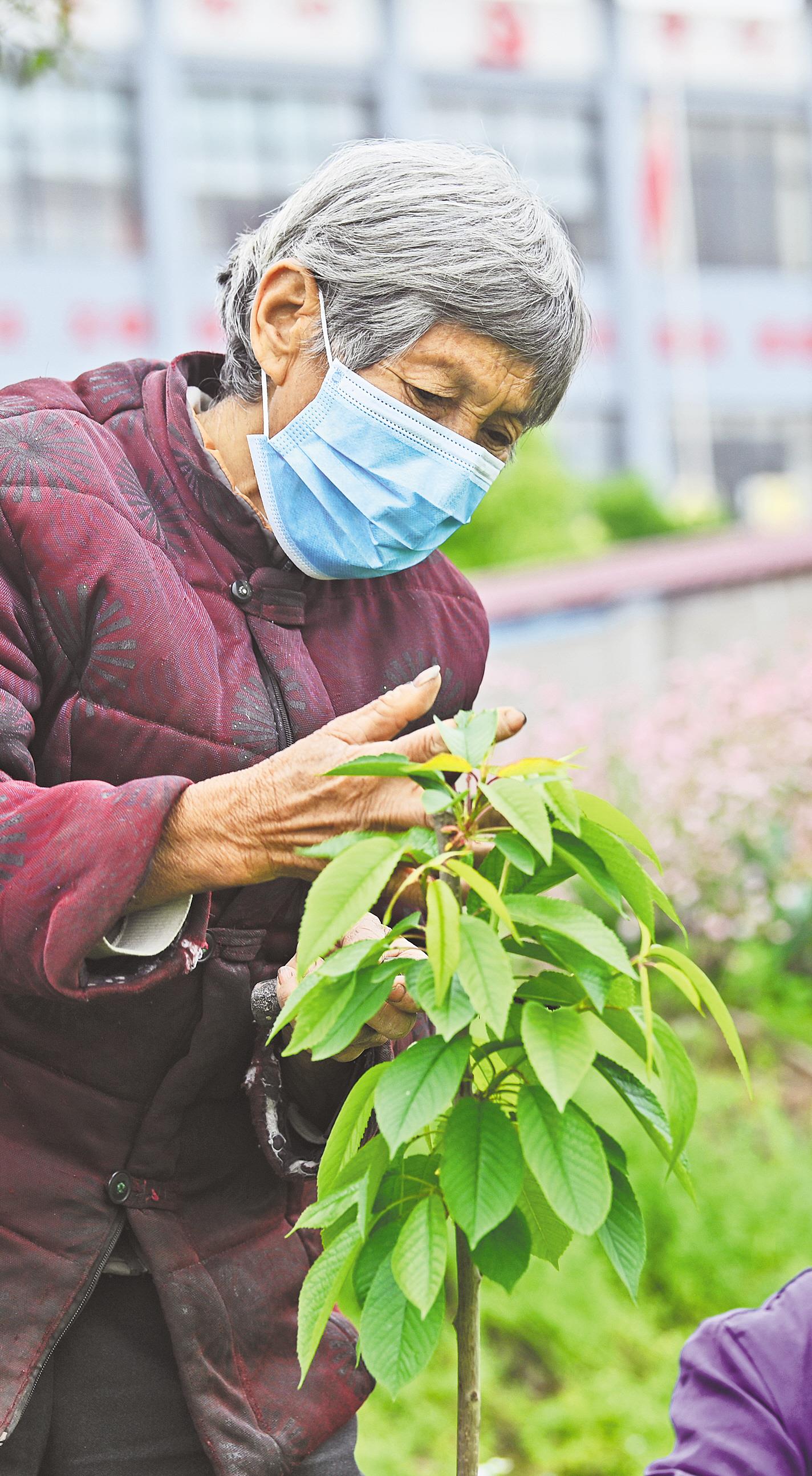 不远处的大樱桃种植基地,76岁的脱贫户宋祖贵带着儿子,在志愿者的指导下,进行除草和修枝。这份工作对她来说既轻松,还可以得到一份工钱,宋祖贵干得特别带劲。