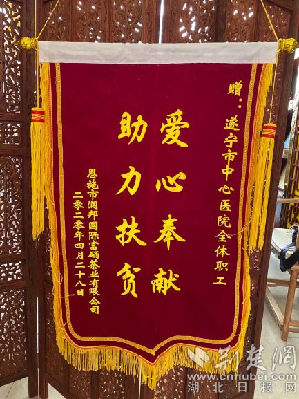 原来,这是湖北恩施市润邦国际富硒茶业有限公司代表侗乡5万名茶农专程送给四川遂宁市中心医院的。随着感谢信和锦旗一同来到遂宁的,还有遂宁市中心医院职工爱心认购的1779份、价值35.58万元的茶叶。