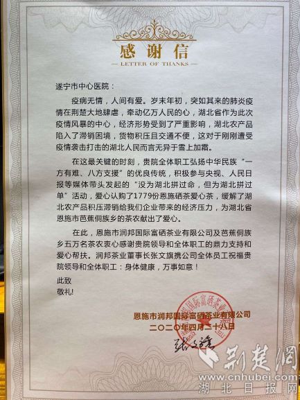 荆楚网客户端—荆楚网消息(通讯员孙军 胡建斌)4月28日下午,四川遂宁市中心医院收到一封来自湖北恩施市芭蕉侗族乡的感谢信:“……在这最关键的时刻,贵院全体职工弘扬中华民族‘一方有难、八方支援’的优良传统……爱心认购了1779份恩施硒茶爱心茶,缓解了湖北农产品积压滞销给我们企业带来的经济压力,为我乡茶农献出了爱心……”