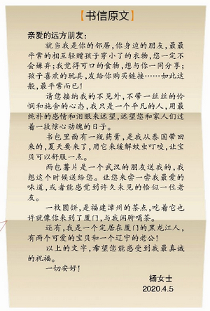 “这封信与那些礼物不同,如果说礼物是送给我们家的,那么这封信是写给所有武汉人的。”张先生告诉记者,在那段黑暗的日子里,包括自己在内的许多武汉人经历着煎熬,而远在千里之外素未谋面的厦门卖家,以这样的方式,鼓舞了他和他的家人。