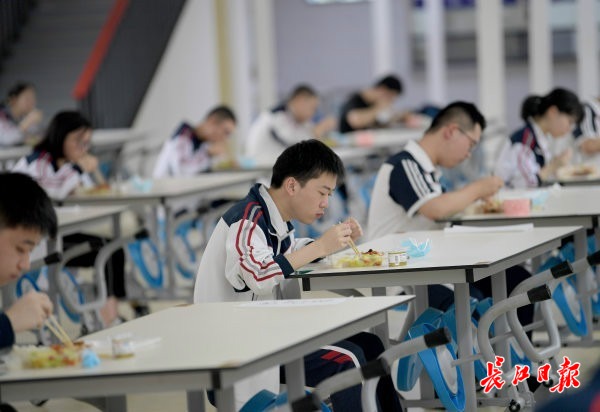 7日中午,武汉市第十四中学高三学生在教室内就餐。 记者 吴曈 摄
