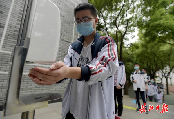 5月7日,武汉市武昌文华中学,同学们排队进入食堂。 记者史伟 摄