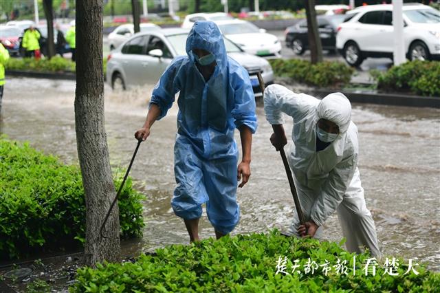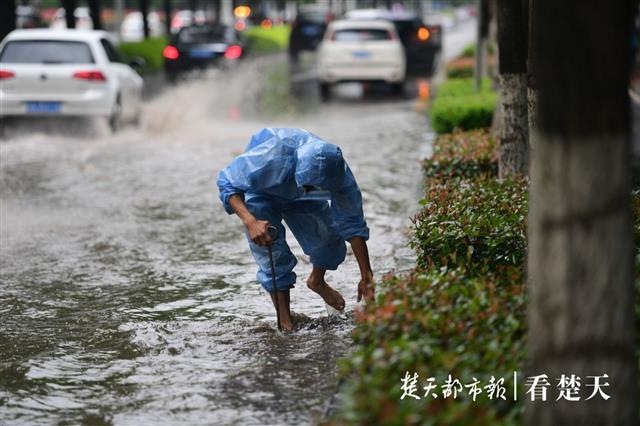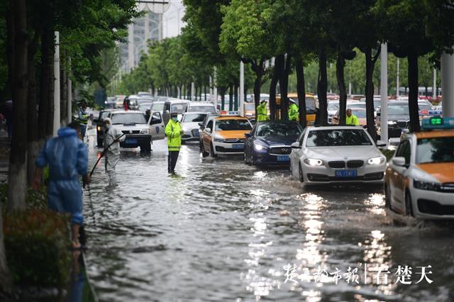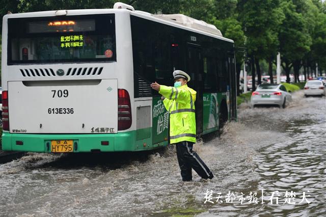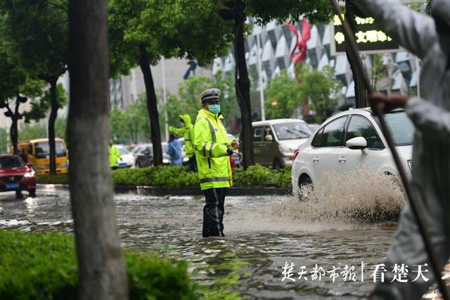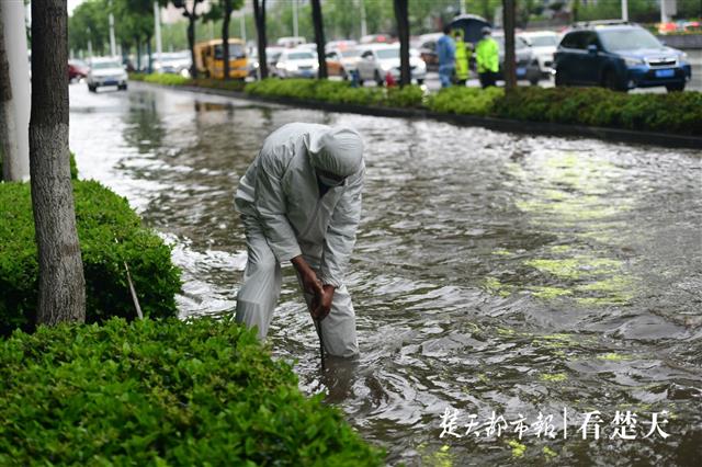 8时许,正值上班高峰,车流缓慢。迅速赶来的交警在积水中疏导交通,水务工作人员在水中寻找下水道堵点。