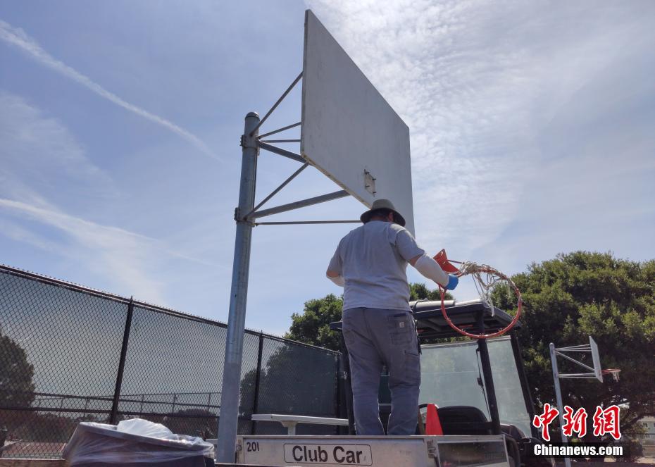 - 当地时间5月7日,美国北加州旧金山湾区米尔斯高中的工作人员拆除校园里的篮球框。为阻止人们在新冠肺炎暴发期间聚众打篮球,这所学校拆除了校园内所有篮球框。 中新社记者 刘关关 摄