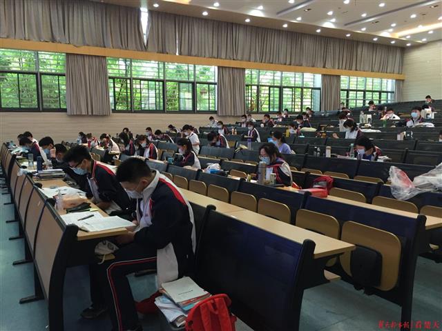 记者在华科大附中看到,一间考场(教室)不超过30人,学生和监考老师都戴着口罩,学生们安静地奋笔疾书。