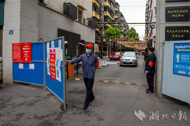 5月9日,武汉市江岸区艺苑社区,工作人员在卡口值守。