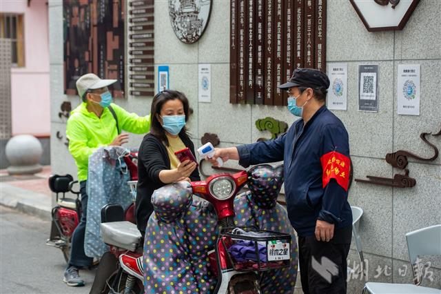 5月9日,武汉市江岸区艺苑社区,居民扫码测温进出小区。