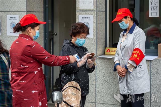 5月9日,武汉市江岸区艺苑社区,居民扫码测温进出小区。连日来,该社区持续强化小区封闭管理,对进出人员做到“四个必须”,即身份必问、体温必测、信息必录、口罩必戴。(湖北日报全媒记者 蔡俊 摄)