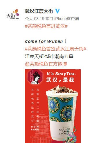 茶颜悦色首签店落在了武汉江宸天街,2021年6月茶颜悦色武汉城市概念店将在这里开启。武汉江宸天街位于汉口交通枢纽范湖站,也是武汉新晋的“潮尚”商业体。