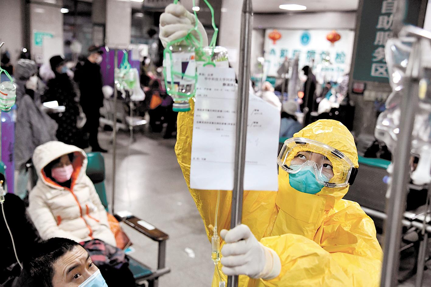 2月3日,武汉协和医院发热门诊, 门诊手术室护士长余文静给发热患者输液。(视界网 刘坤维 摄)