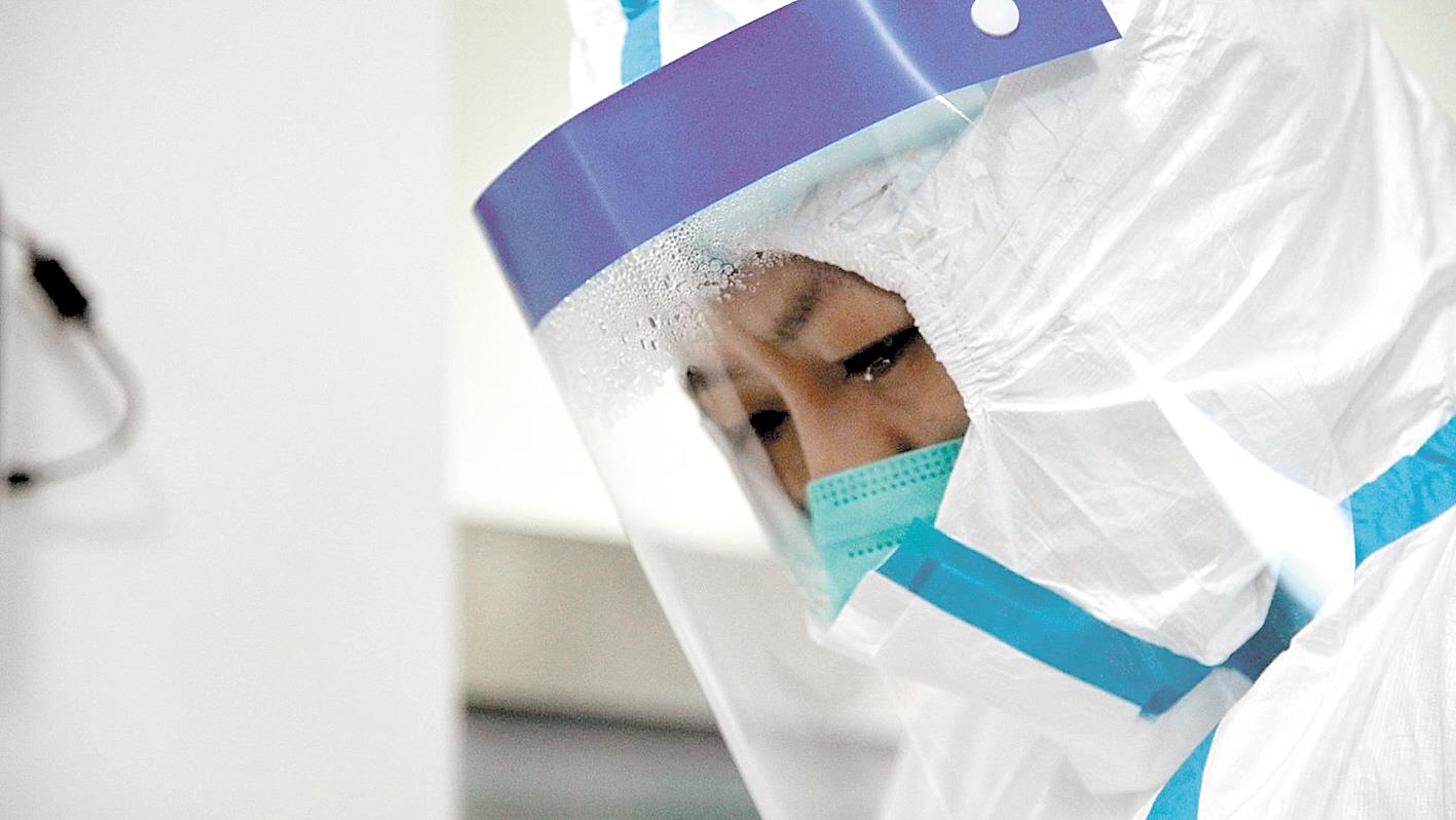 1月21日, 武汉协和医院发热门诊,感染科护士喻银燕正在工作,其防护面屏和睫毛上结满水汽,如同晶莹的泪珠。 (视界网 刘坤维 摄)