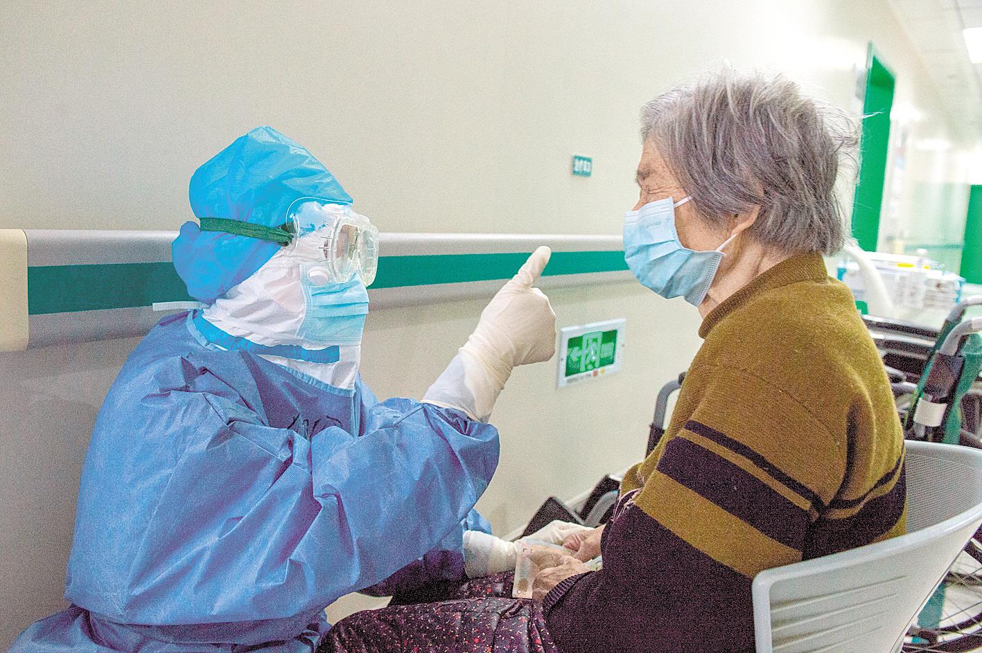 3月2日,武汉市第一医院感染科隔离病房,护士周洁(左)鼓励患者增强信心。 (湖北日报全媒记者 蔡俊 摄)