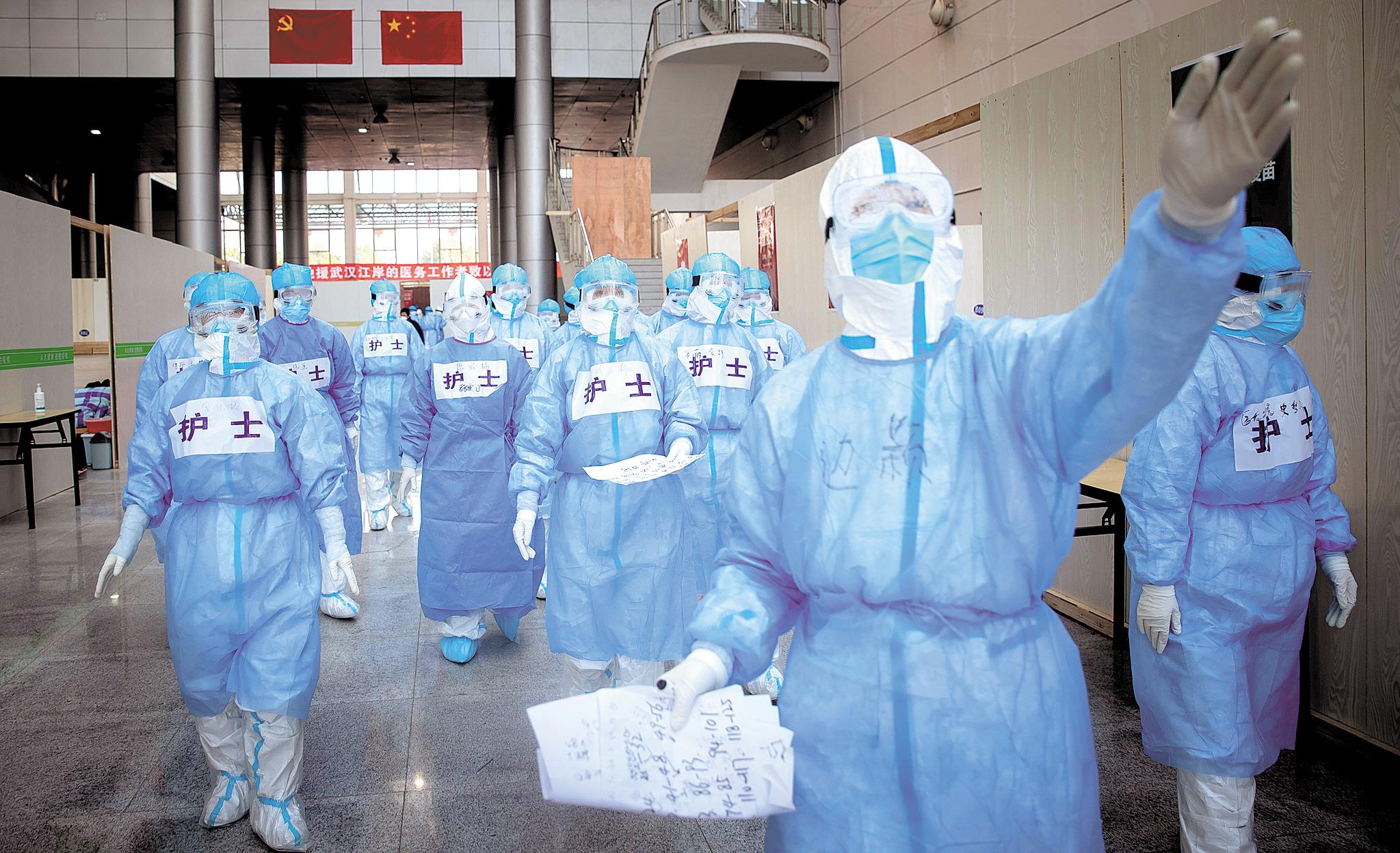 2月12日,第一次进入武汉江岸方舱医院的护士们在抓紧熟悉环境和流程。(湖北日报全媒记者 柯皓 摄)