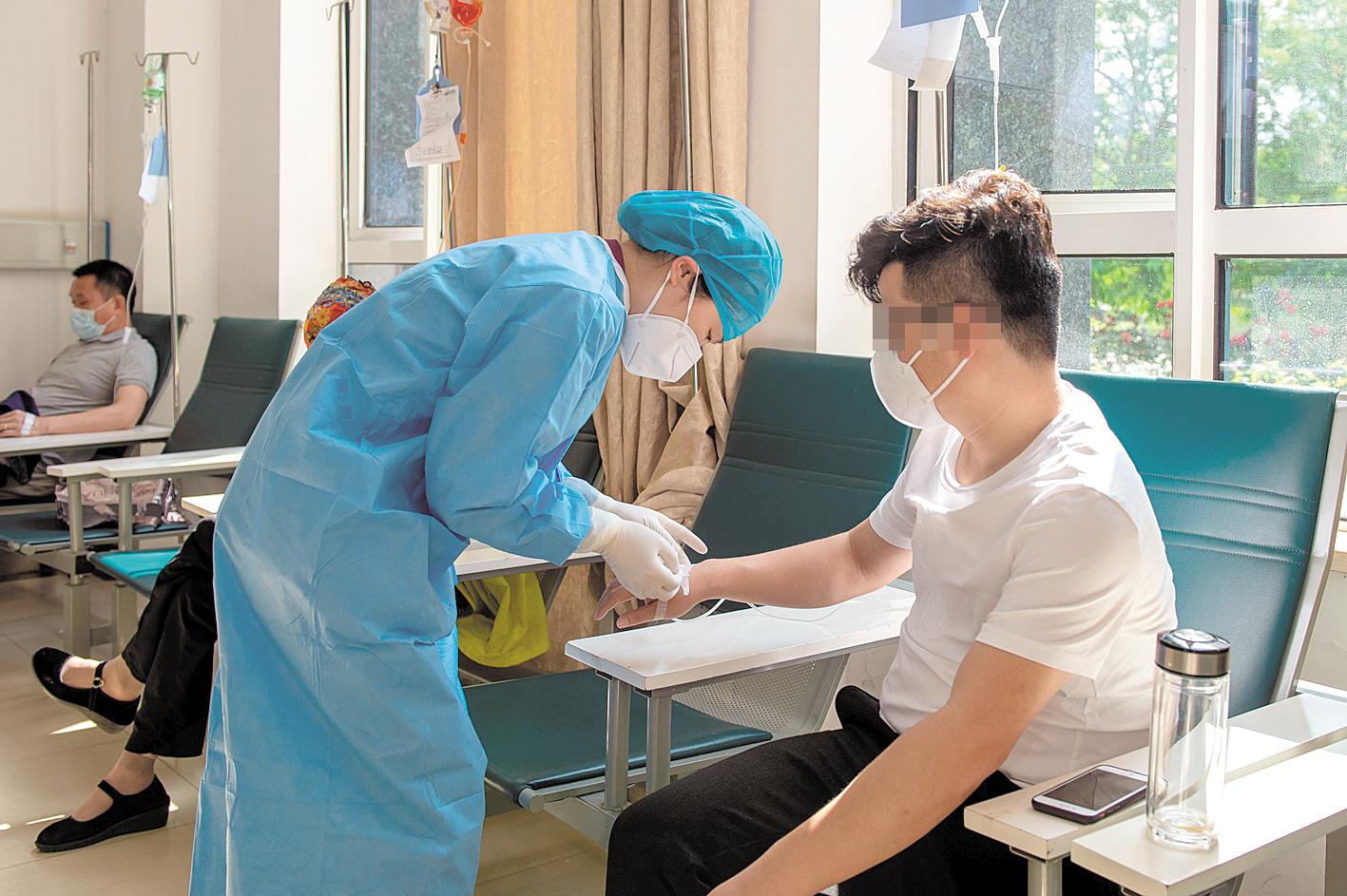 5月11日,武汉市中医医院急诊科护士靳艳为患者输液。(湖北日报全媒记者 蔡俊 摄)