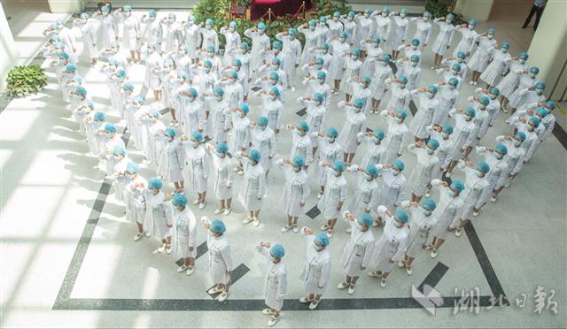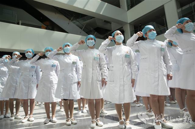 5月12日,护士代表们重温南丁格尔誓词。当天,武汉同济医院中法新城院区,百余位60、70、80、90年代出生的老中青护士代表一起重温南丁格尔誓词,迎接这个特殊的节日。(湖北日报全媒记者 柯皓 通讯员 童萱 摄)