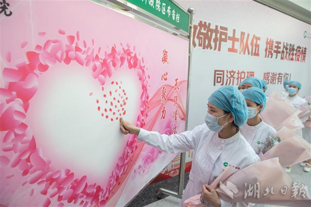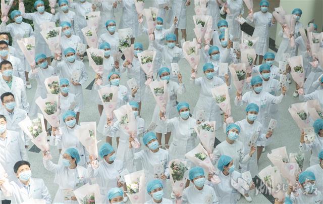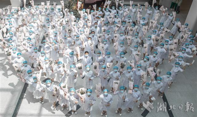 5月12日,获赠鲜花的护士们在拍照合影。