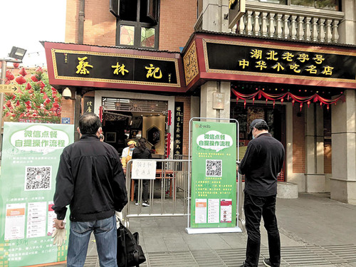 消费者在老字号蔡林记门口扫码就餐。(湖北日报全媒记者 艾红霞 摄)
