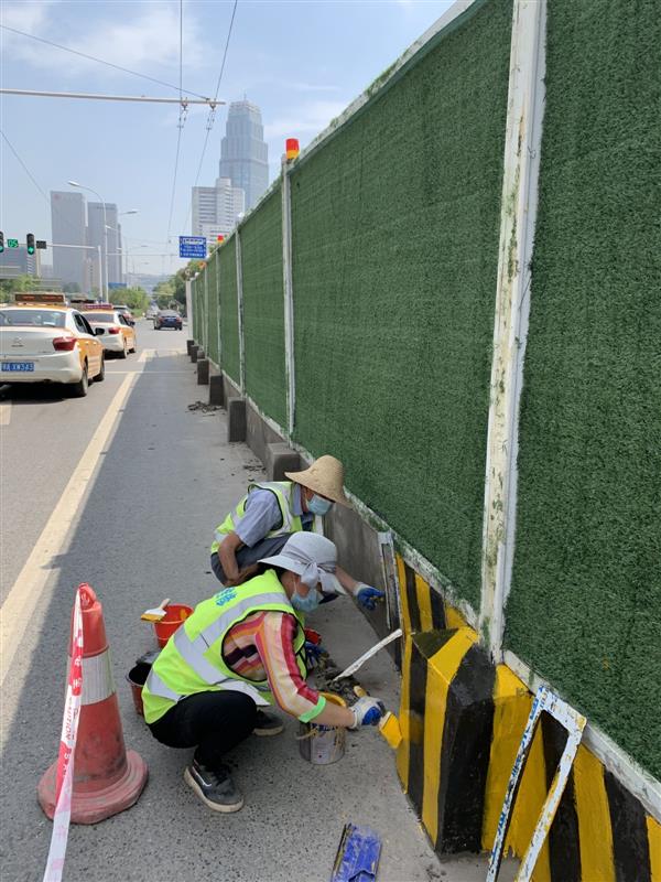 记者看到,施工路段长约数十米,占去一股车道,有工人正在为围挡基座刷黄黑相间的交通警示标识。