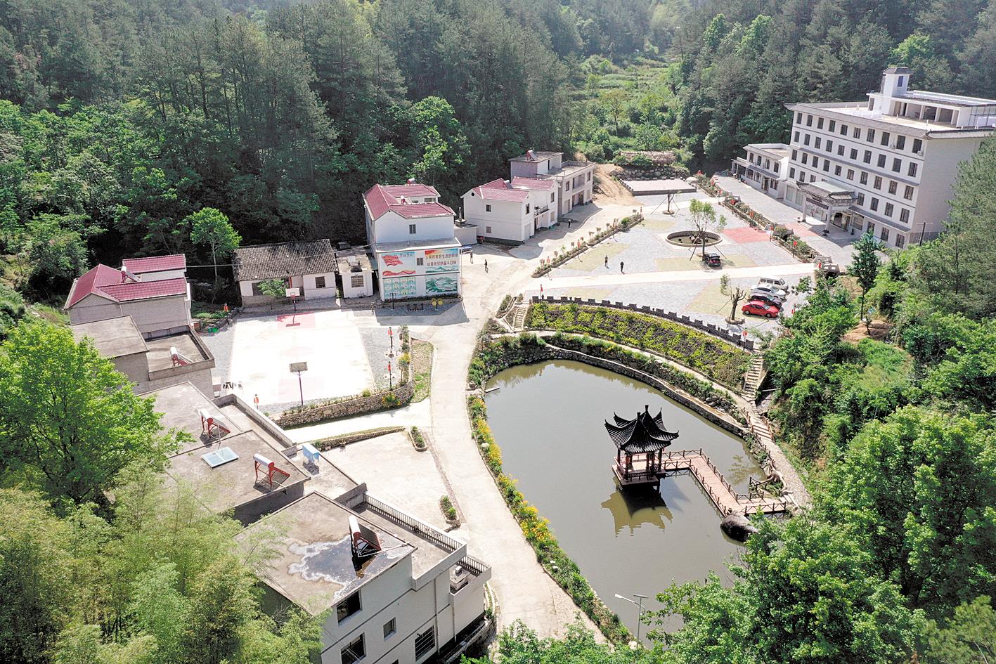 塆头的池塘和迎客亭。(视界网 邱亚林 摄)