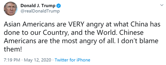 当地时间5月12日,特朗普发了这样一条推文:“亚裔美国人对中国对我们国家和世界所做的一切感到非常愤怒。而华裔美国人是所有亚裔中最愤怒的。我不怪他们!”↓