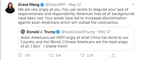 据美国全国广播公司(NBC)报道,华裔女议员、民主党全国委员会副主席孟昭文直言不讳地表示,“我们对你很愤怒”。孟昭文指责特朗普是在用种族主义言论来转移人们对他应对疫情不力的注意力。还有人直言,美国总统并不能代表亚裔美国人的意见。