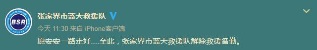 18日上午,张家界市蓝天救援队发布微博称:“愿安安一路走好……至此,张家界市蓝天救援队解除救援备勤。”此后,多家国内媒体报道称,失联女生刘某已经被找到,但已不幸身亡。