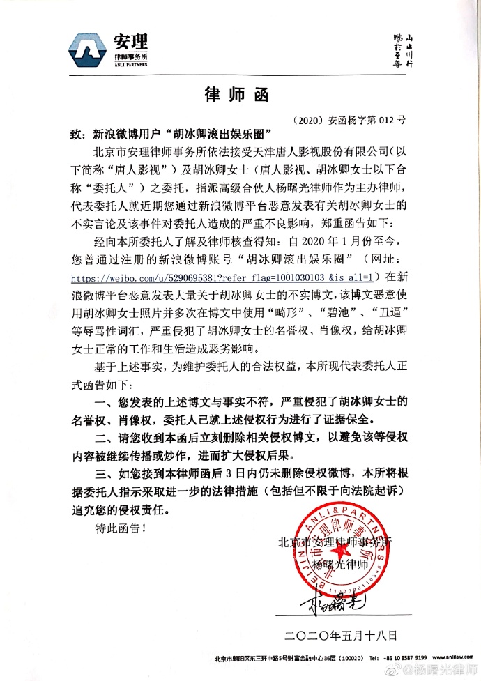 律师函中提到,有微博名为“胡冰卿滚出娱乐圈”的网友,发布了大量恶意辱骂胡冰卿的不实信息,对胡冰卿造成了严重不良影响;并要求对方立即删除相关博文,否则将追究侵权责任。