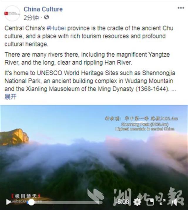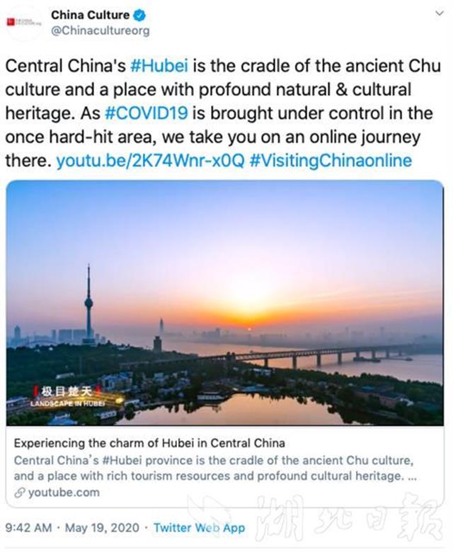 湖北日报讯(记者王理略、通讯员鄂文旅)5月19日,中国旅游日。当天,中国文化网英文版及Facebook、Youtube、Twitter、Instagram四大海外社交平台在海外同步推出“灵秀湖北·楚楚动人”湖北文化旅游线上宣传推广,中央媒体海外账号同步转发。全世界网友在特殊时期足不出户“云游湖北”,欣赏湖北灵山秀水、领略荆楚文化魅力。