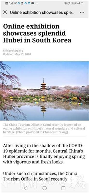此前,在文化和旅游部国际交流与合作局的支持下,湖北省文化和旅游厅与特拉维夫中国文化中心联合推出一系列“灵秀湖北·楚楚动人”文化旅游精品图片展和专题宣传推广活动。与中国驻韩国旅游办事处联合推出“云游中国——行走湖北山水间”图片视频展,与中国驻苏黎世旅游办事处联合在当地旅游杂志上为湖北旅游复苏做宣传,惠灵顿中国文化中心推出“灵秀湖北 凤凰涅槃”专题,仰光中国文化中心推出“云游中国——寻访心中的湖北”专题,吉隆坡中国文化中心推出“云游中国——这里是湖北”云观览,贝宁中国文化中心推出纪录片《中国抗疫志——这里是武汉》和“欢迎您到武汉来”专题。本月下旬,湖北省文化和旅游厅还将联合新加坡中国文化中心推出“云游中国——寻访最美湖北”系列宣传活动。