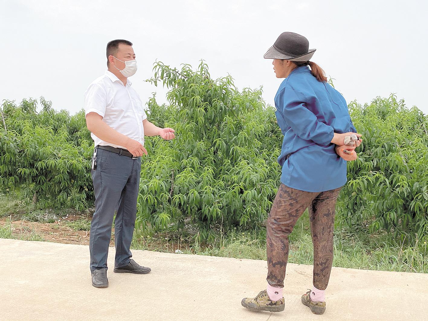 张文喜(左)向早熟桃基地业主了解桃子长势。