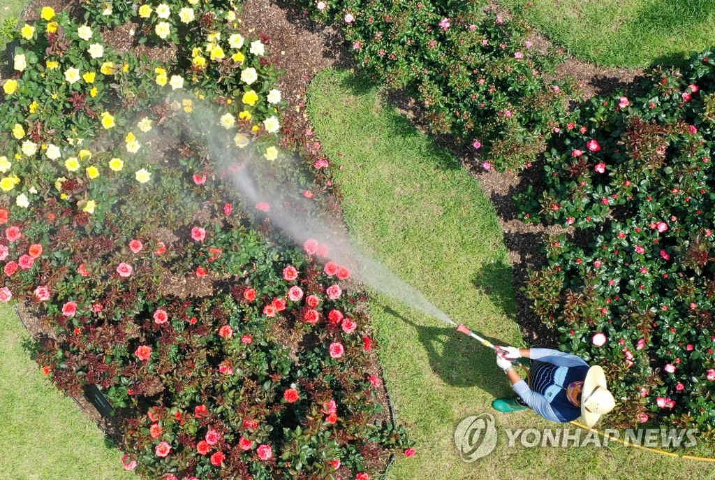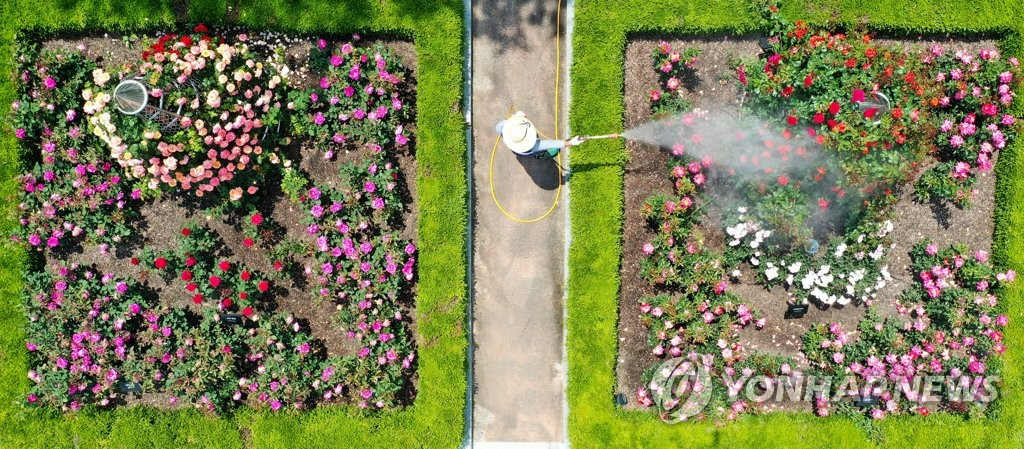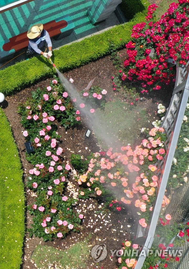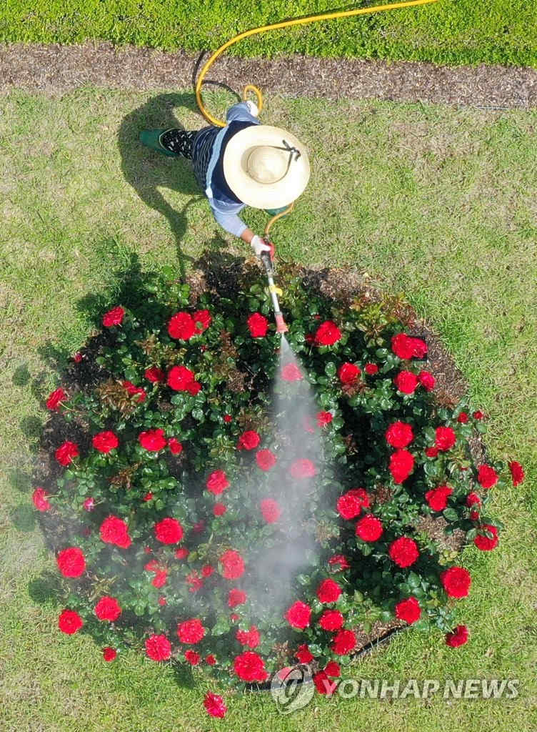 21日上午,光州东区某大学玫瑰园的管理人员正在为色彩缤纷的玫瑰浇水。