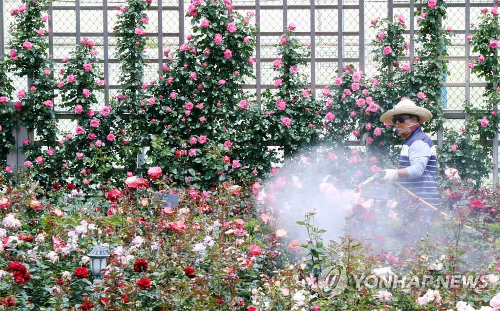 21日上午,光州东区某大学玫瑰园的管理人员正在给盛放的玫瑰浇水。
