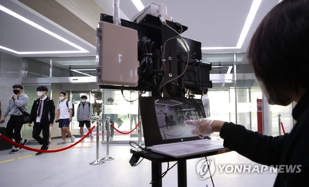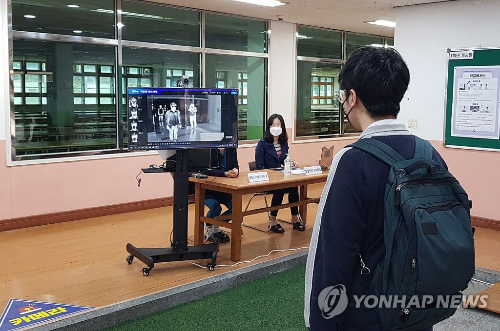 在蔚山市南区文殊高中,学生在进入教室之前,通过热成像体温测量仪接受体温检测。